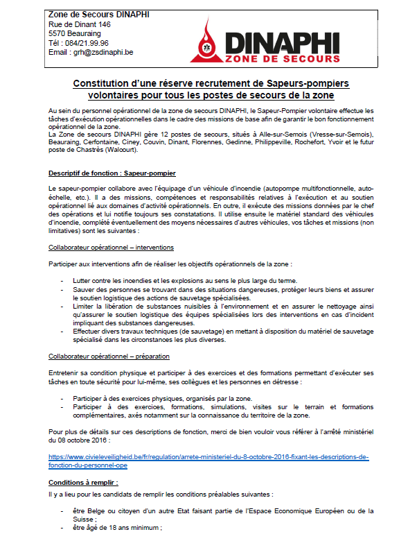La Zone de Secours DINAPHI nous fait savoir qu’elle constitue une réserve de recrutement de Sapeurs-Pompiers volontaires pour tous les postes de secours de la zone.