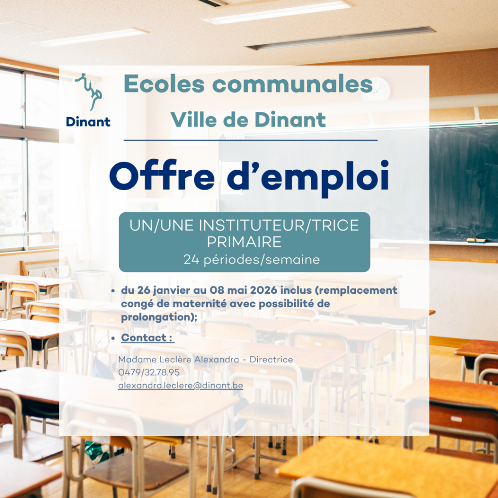 𝘂𝗻/𝘂𝗻𝗲 𝗶𝗻𝘀𝘁𝗶𝘁𝘂𝘁𝗲𝘂𝗿/𝘁𝗿𝗶𝗰𝗲 Primaire à raison de 24 périodes/semaine du 26 janvier au 08 mai 2026 inclus (remplacement congé de maternité avec possibilité de prolongation);