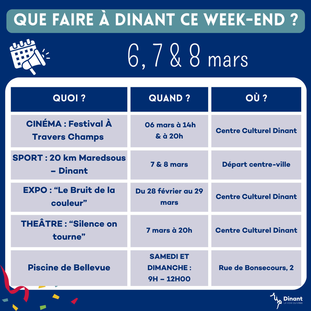 Découvrez les 𝗱𝗶𝗳𝗳𝗲́𝗿𝗲𝗻𝘁𝘀 𝗲́𝘃𝗲̀𝗻𝗲𝗺𝗲𝗻𝘁𝘀 𝗲𝘁 𝗮𝗰𝘁𝗶𝘃𝗶𝘁𝗲́𝘀 à faire dans notre belle commune, durant ce week-end du vendredi 06/03 au dimanche 08/03. ⇒