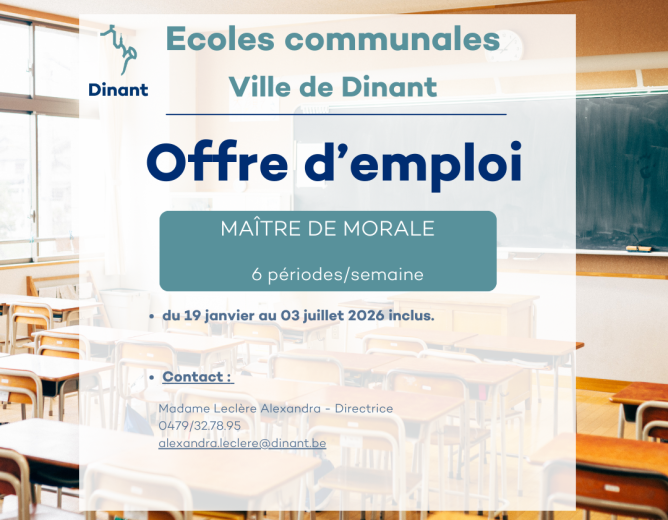 Les écoles communales de Dinant recherchent : 𝘂𝗻 𝗺𝗮𝗶̂𝘁𝗿𝗲 𝗱𝗲 𝗺𝗼𝗿𝗮𝗹𝗲 à raison de 6 périodes/semaine...
