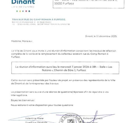 📢 Réunion d’information – Travaux rue du Camp Romain à Furfooz La Ville de Dinant vous...