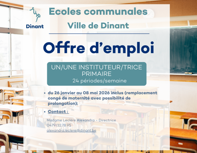 Les écoles communales de Dinant recherchent : 𝘂𝗻/𝘂𝗻𝗲 𝗶𝗻𝘀𝘁𝗶𝘁𝘂𝘁𝗲𝘂𝗿/𝘁𝗿𝗶𝗰𝗲 Primaire à raison de 24 périodes/semaine du...