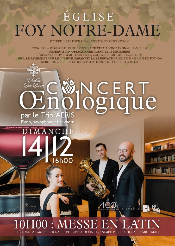 A la recherche des sonorités d’Adolphe Sax, venez découvrir le Trio Aeris, venant de Paris : piano, saxophone et saxhorn dans des œuvres pétillantes (N.Rota, F.Poulenc, …). Le concert sera accompagné d’une dégustation des vins de Bon Baron (Dinant).