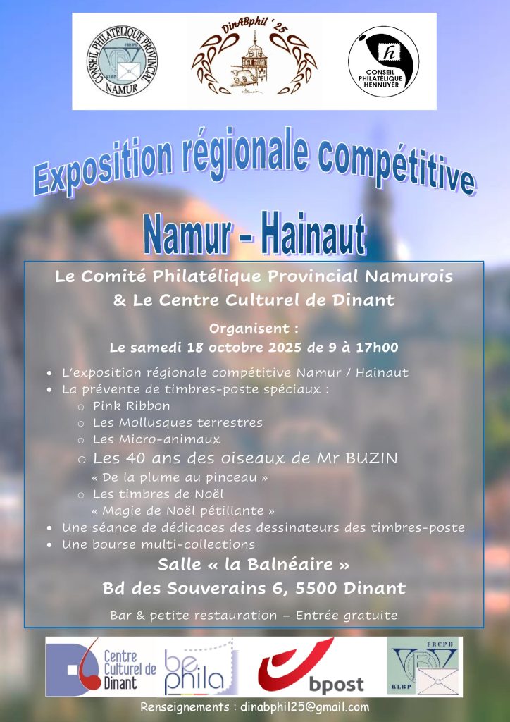 Le Comité Philatélique Provincial Namurois, en collaboration avec le Centre culturel de Dinant et Bpost, organise le samedi 18 octobre 2025 la 5e prévente officielle de timbres-poste de l’année, couplée à l’exposition régionale compétitive Namur–Hainaut (DinABphil’25).