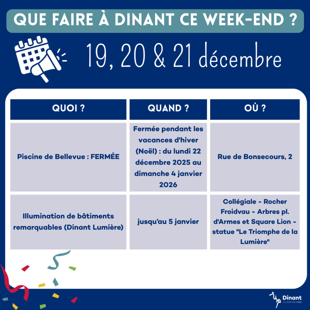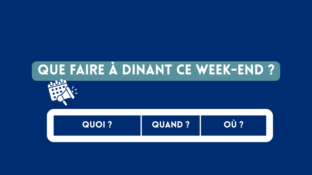 Si vous souhaitez partager vos évènements sur le territoire de Dinant, n'hésitez pas à nous contacter par email avec toutes les informations : communication@dinant.be