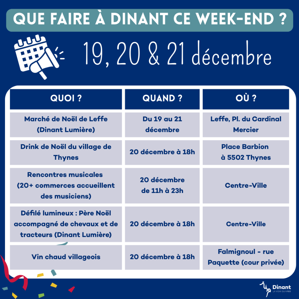 Découvrez les 𝗱𝗶𝗳𝗳𝗲́𝗿𝗲𝗻𝘁𝘀 𝗲́𝘃𝗲̀𝗻𝗲𝗺𝗲𝗻𝘁𝘀 𝗲𝘁 𝗮𝗰𝘁𝗶𝘃𝗶𝘁𝗲́𝘀 à faire dans notre belle commune, durant ce week-end du vendredi 19/12 au dimanche 21/12