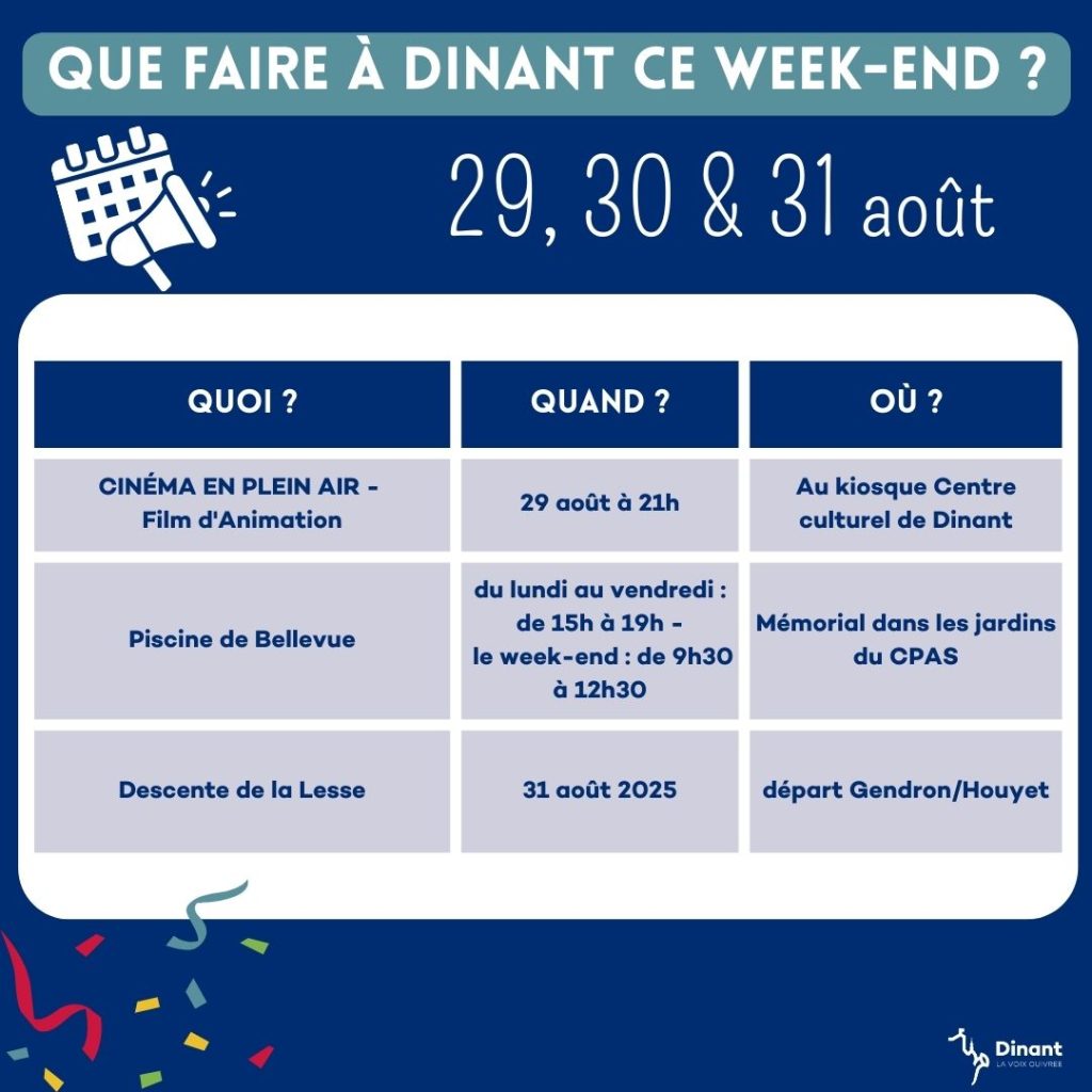 Si vous souhaitez partager vos évènements sur le territoire de Dinant, n'hésitez pas à nous contacter par email avec toutes les informations : communication@dinant.be