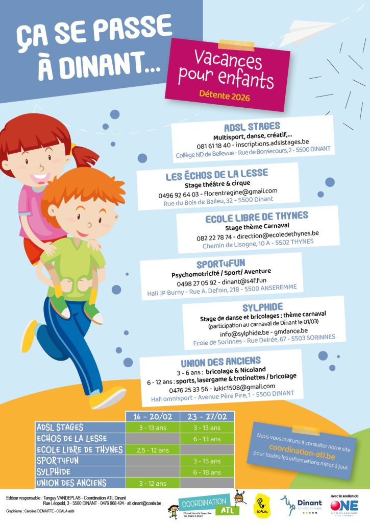 Pendant les vacances de détente, de nombreux stages sont organisés sur le territoire de la Ville de Dinant pour les enfants de 2,5 à 18 ans.